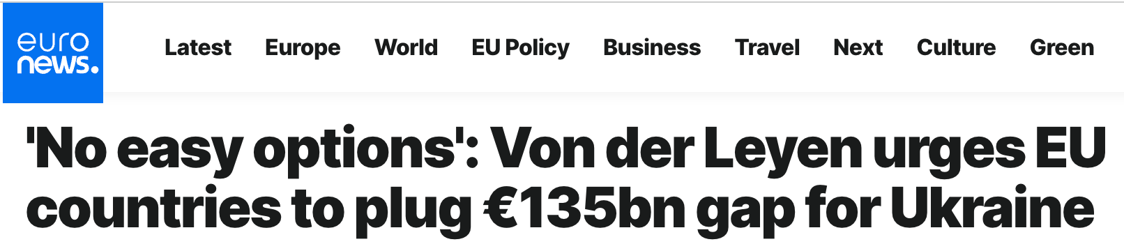 会议召开前几天,欧盟委员会主席冯德莱恩致信各成员国领导人,就乌克兰未来融资计划提出“非此即彼”的选择:要么举借新债,要么动用被冻结的俄罗斯资产。信中列出了未来两年满足乌克兰军事与财政需求的三大选项。